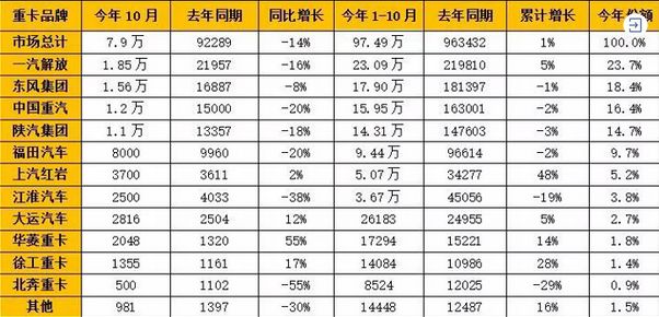 1-10月,重卡行业的排位赛竞争激烈,增速抢眼的企业主要是红岩、徐工和华菱。其中,“状元”一汽解放10月份销售重卡1.85万辆,1-10月累计销售23.09万辆,同比增长5%,市场份额23.7%,今年以来的累计销量继续保持行业第一。行业“榜眼”东风重卡10月份销售1.56万辆,1-10月累计销售17.90万辆,同比下降1%,市场占有率为18.4%。