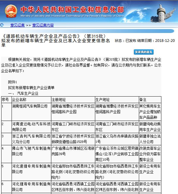 近日,工信部公布了《道路机动车辆生产企业及产品公告》(第315批)拟发布的新增车辆生产企业公告。从公告内容上看,本次拟增21家车企,其中17家是专用车车企,名单如下: